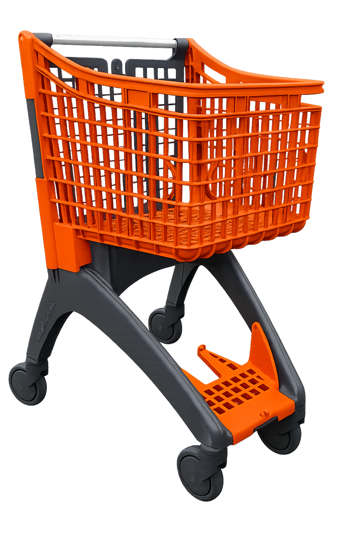 New raised compact basket made of 100% polypropylene, light weight and highly durable, suitable for both small and large retail formats. Equipped with a Ø125 mm wheel platform and fully compatible with travelators.